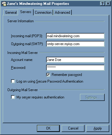 1. Server Port Numbers: Mindwatering uses the standard ports 25 and 110. These do not need to be changed.