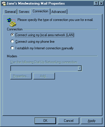 This tab allows you to choose whether Outlook should use an existing network connection or a dial-up connection when starting Outlook. If you choose a dial-up connection, Outlook will automatically dial your ISP if it is not already dialed.