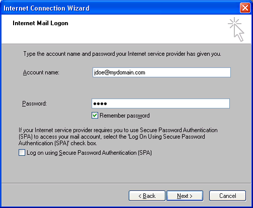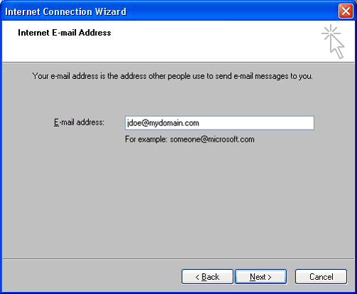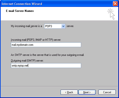 Under the Incoming server field,enter your domain name preceeded by mail. e.g. mail.mydomain.com. Next enter your ISP's (Internet Service Provider - e.g. Earthlink, or Time Warner) outgoing SMTP server (e.g. smtp.earthlink.net, you have to get this address from your ISP). Click the "Next" button again.