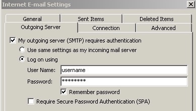 - a. Under the "Outgoing Server" tab, you can update your Username (e-mail address) and Password.