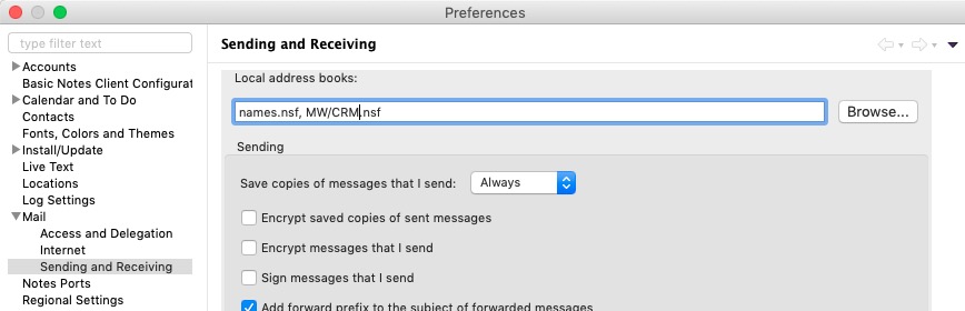 Preferences --> Mail --> Sending and Receiving --> Local address books.