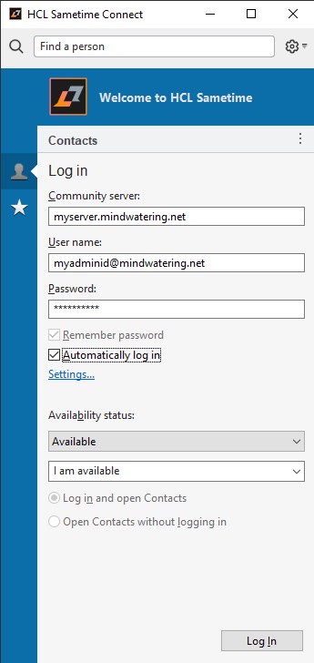 After you launch the Sametime client, the first launch will default to the second tab to complete the Community server login.